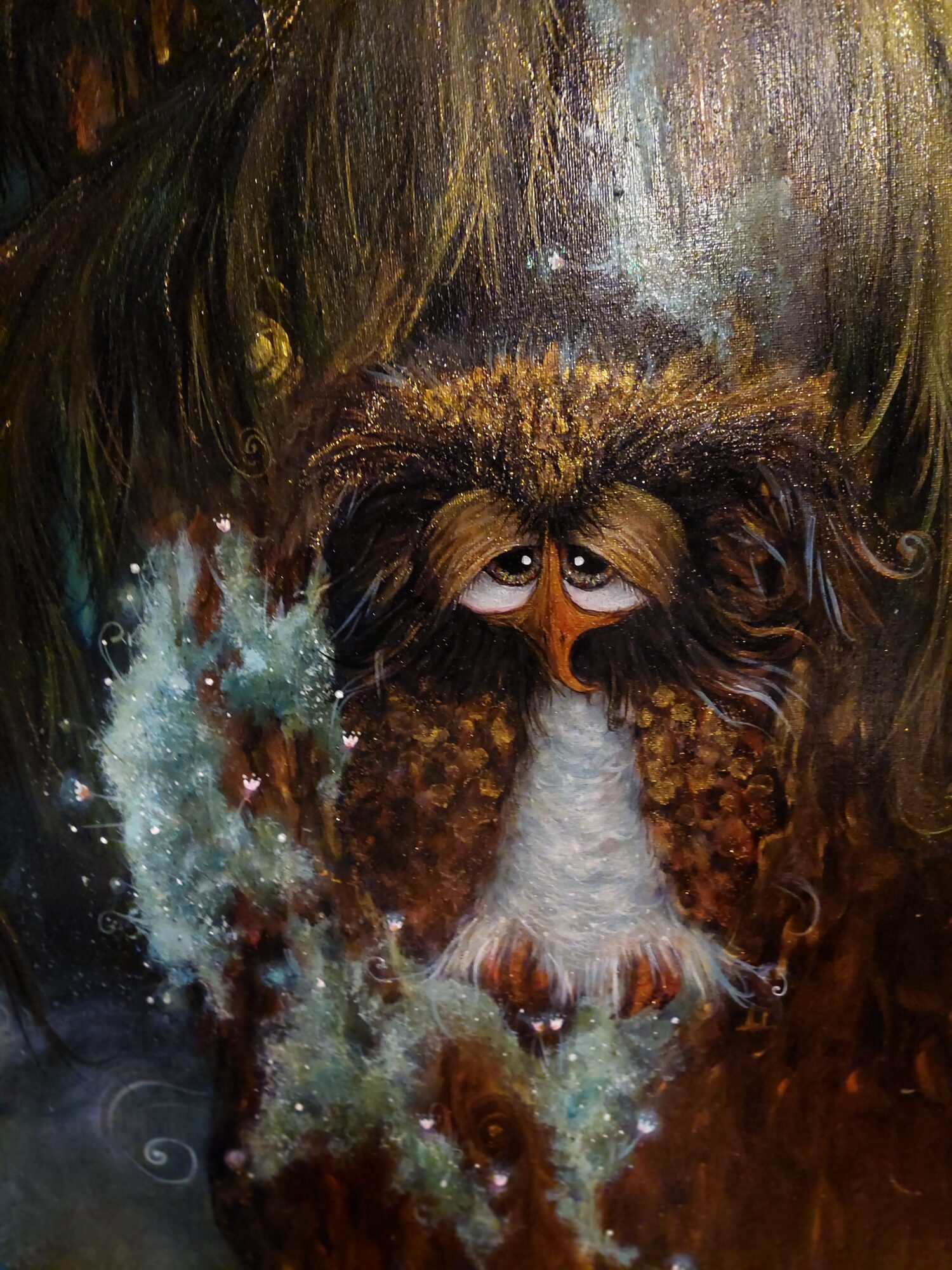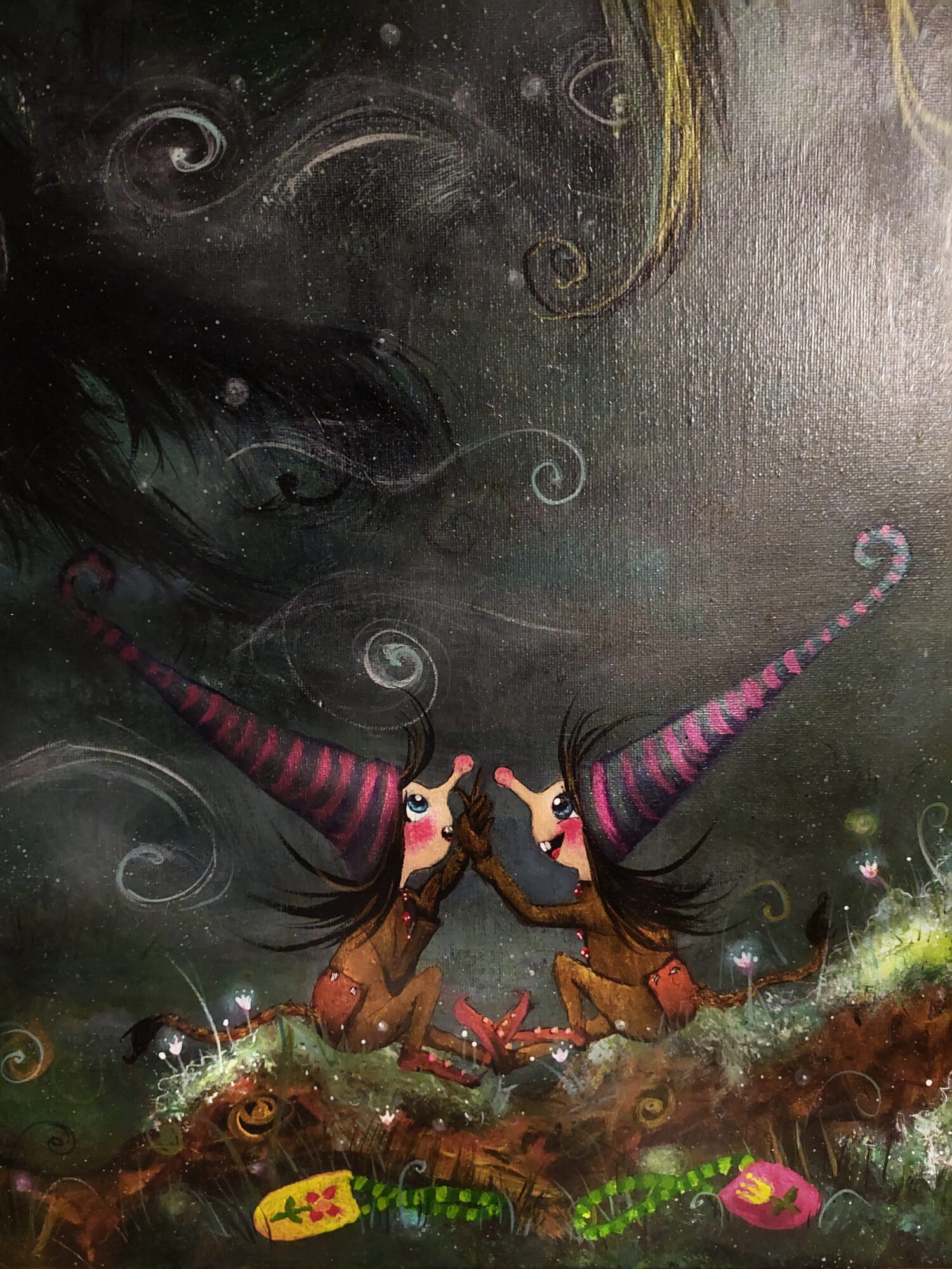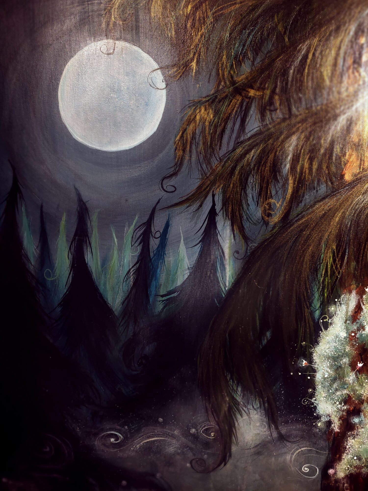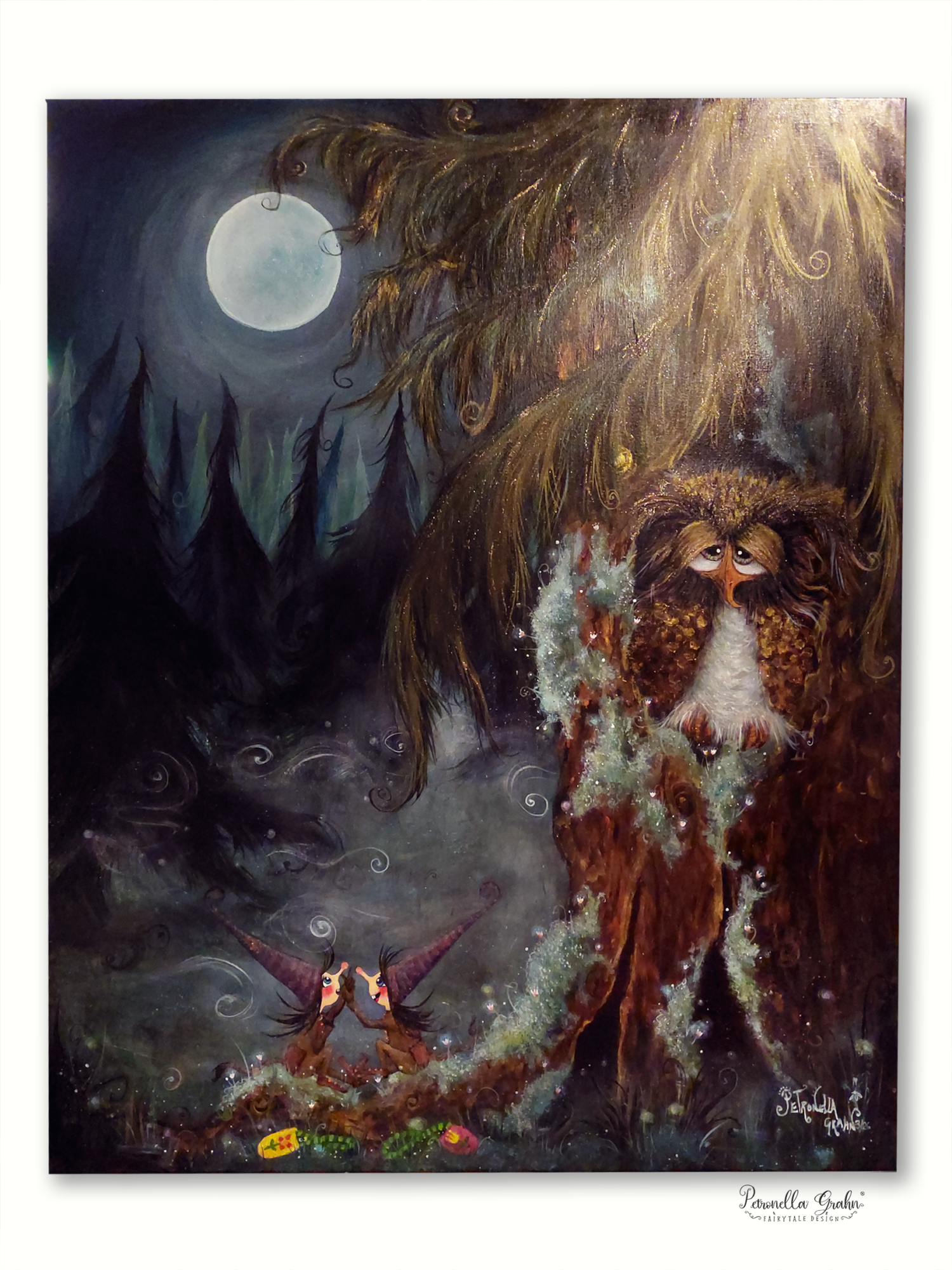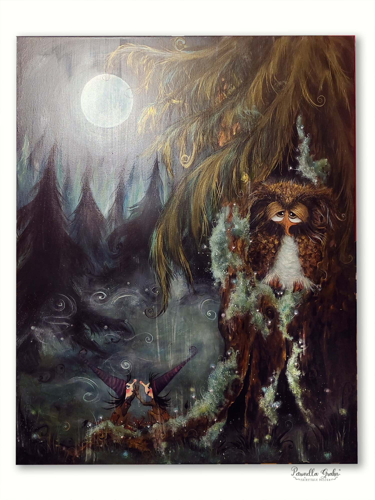 ”Yö ystäväni – Satumetsä Salaisuutenion alkuperäinen 80 × 100 cm satutaulu Ripaus Taikapölyä -kokoelmasta.