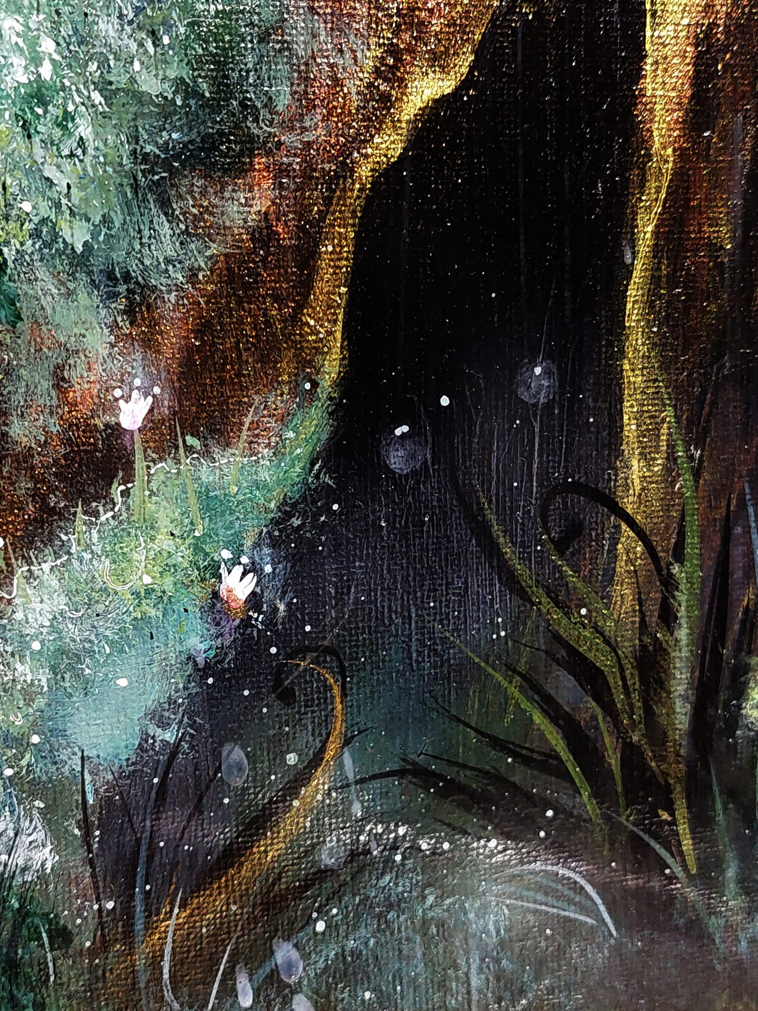Käsin maalattu teos, jossa canvas ja akryyli-sekatekniikka yhdistyvät kimalle-efekteihin ja valoa kerääviin yksityiskohtiin, jotka hehkuvat lempeästi pimeässä.